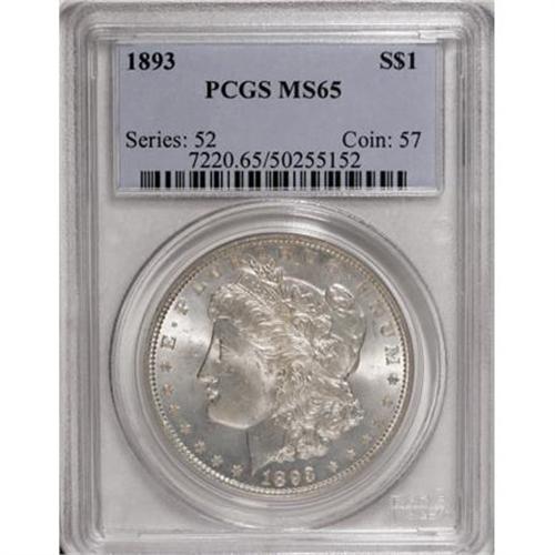 <B>1893 $1 MS65 PCGS.</B></I> This is a satiny Gem that should delight nearly any collector, no matter how fastidious. Both sides have satiny luster with full mint brilliance. Only a few faint whispers of champagne patina offset the essential brilliance of this magnificent Gem. A great example of this low-mintage issue. PCGS has certified a mere four finer representatives (1/08).<BR><I>From The Oxford Collection.</B></I><BR><BR><B>Coin Engraver:</B> George T. Morgan<BR><BR><b>Shipping:</b> Coins & Currency (<a target="_blank" href="http://www.heritageauctions.com/common/shipping.php">view shipping information</a>)