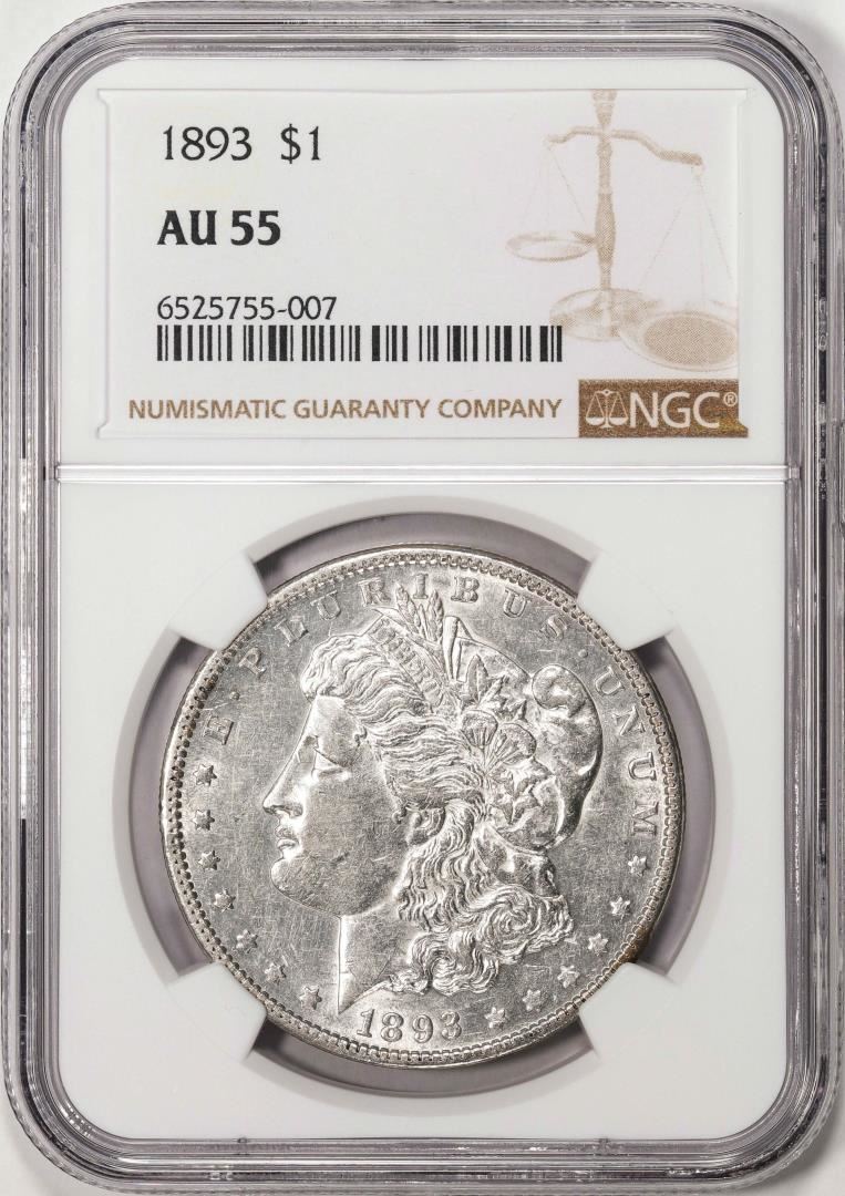 One 1893 $1 Morgan Silver Dollar Coin NGC AU55. NGC Certified.