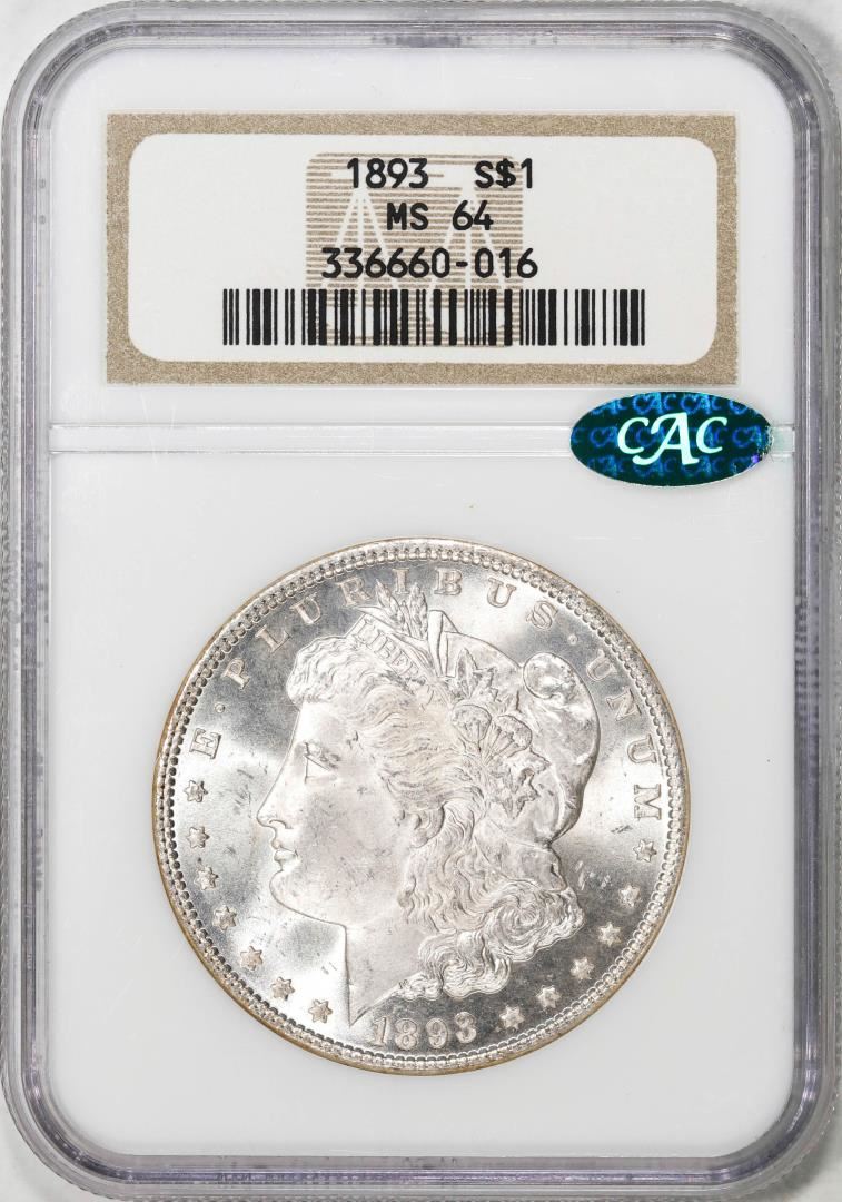 One 1893 $1 Morgan Silver Dollar Coin NGC MS64 CAC. NGC Certified.