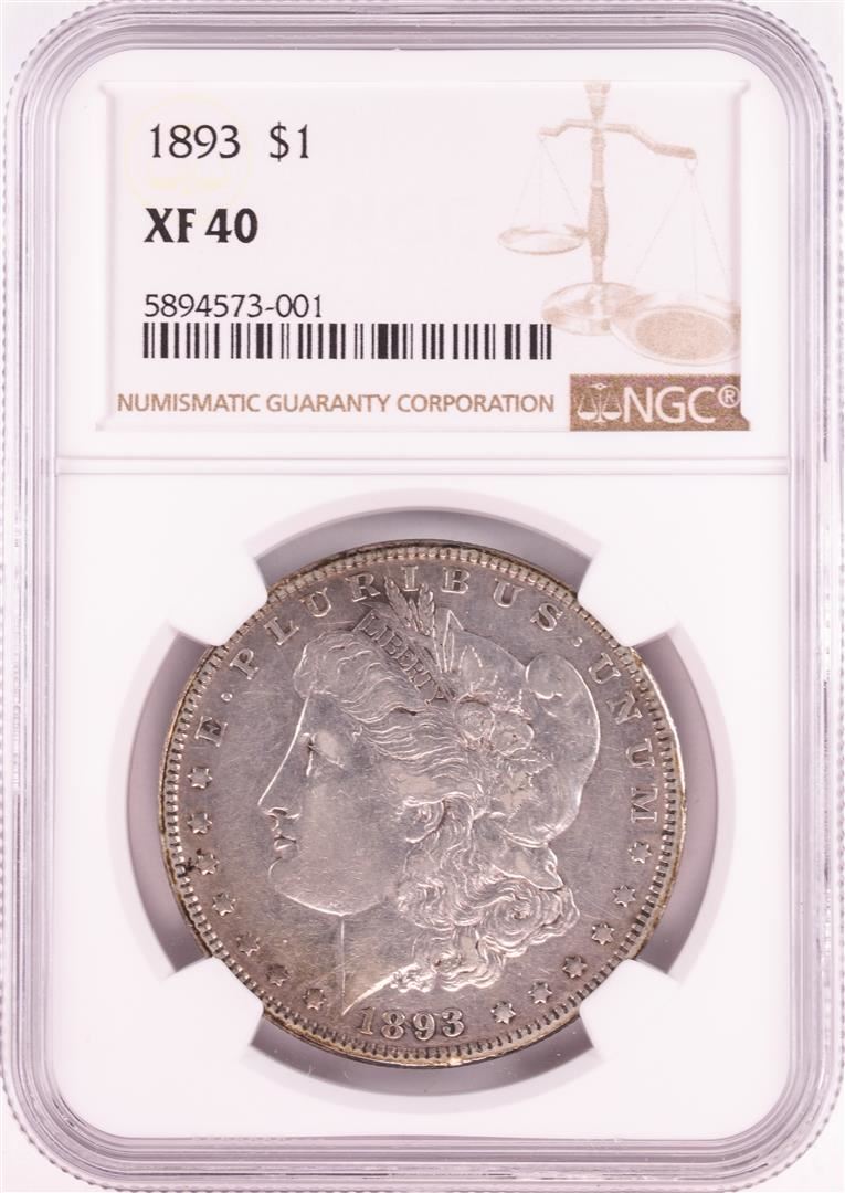 One 1893 $1 Morgan Silver Dollar Coin NGC XF40. NGC Certified.