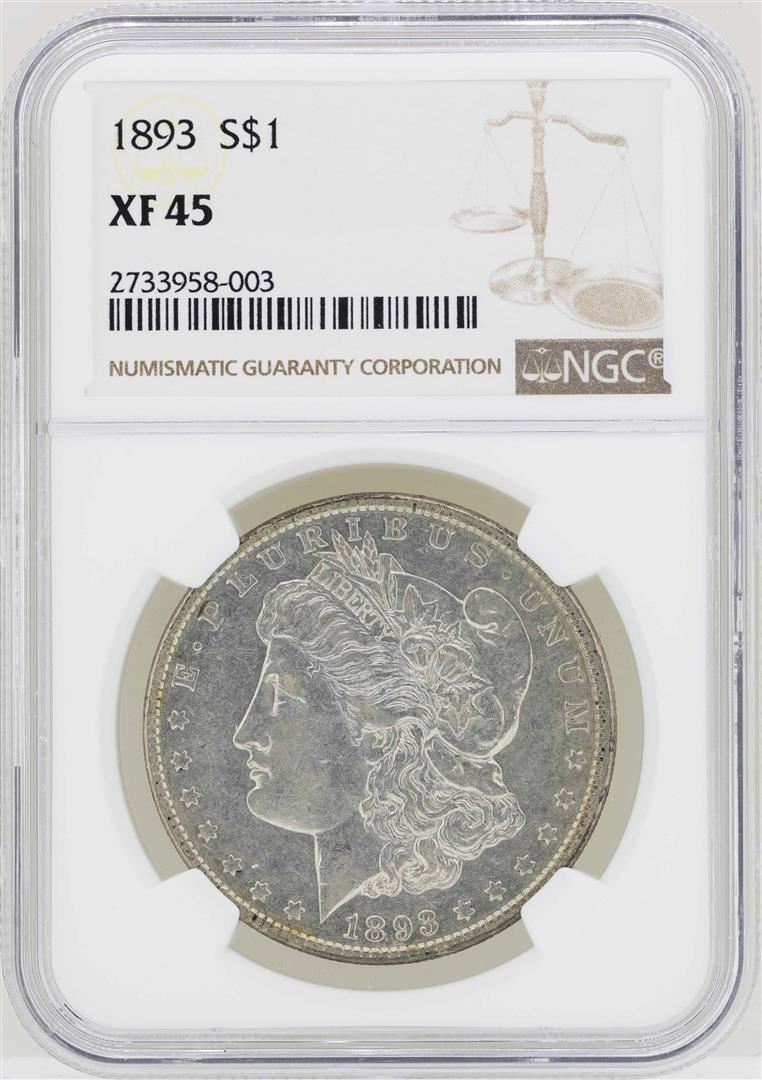 One 1893 $1 Morgan Silver Dollar Coin NGC XF45. NGC Certified.