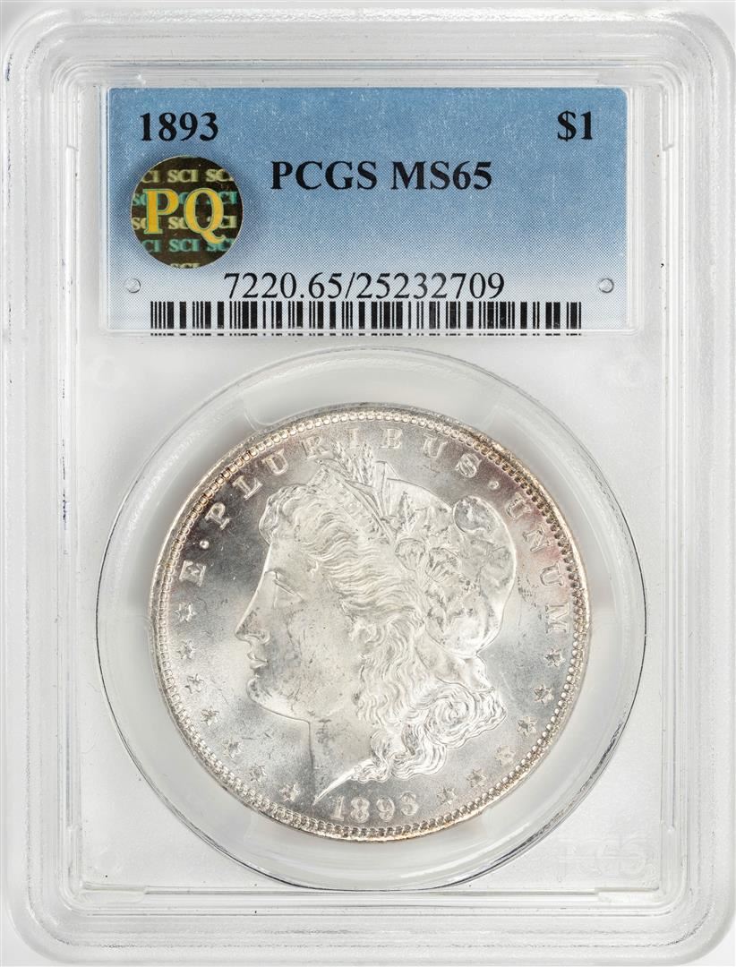 One 1893 $1 Morgan Silver Dollar Coin PCGS MS65 PQ. PCGS Graded.