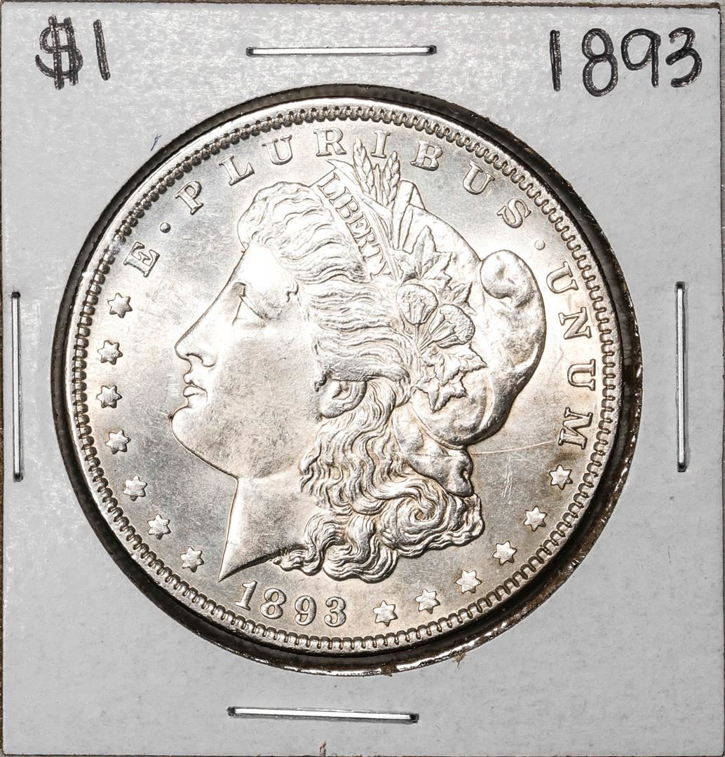 One 1893 $1 Morgan Silver Dollar Coin.