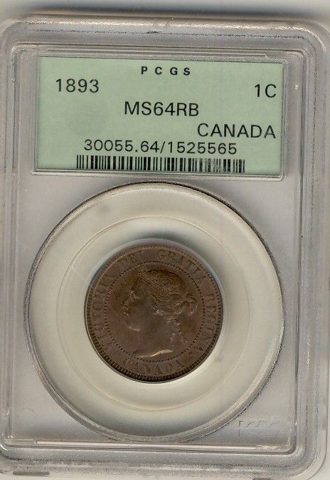 1893 1¢ PCGS MS63RB. Subdued lustre.