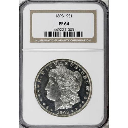<B>1893 $1 PR64 NGC.</B></I> The business strike 1893 is known for its low mintage, but the proof emission is much rarer. Only 792 specimens were issued, and a number were undoubtedly eventually spent by owners or their heirs. This brilliant example has flashy mirrored fields and moderate frost throughout the devices. Slightly soft at the centers, but the overall strike is good.<BR><BR><B>Coin Engraver:</B> George T. Morgan<BR><BR><b>Shipping:</b> Coins & Currency (<a target="_blank" href="http://www.heritageauctions.com/common/shipping.php">view shipping information</a>)