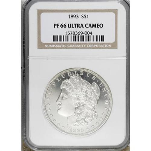 <B>1893 $1 PR66 Ultra Cameo NGC.</B></I> As interest in the Barber minor silver designs waned, so did orders for proof sets of the silver denominations. As a consequence, the Morgan silver dollar, which was included in such sets, saw its production plunge from 1,245 pieces in 1892 to a mintage of just 792 specimens for 1893. On a more positive note, the overall quality of proofs improved between years, with specimens of the latter date offering improved contrast and definition.<BR> Based on those and other attributes, the present piece ranks among the best for the issue. The deeply reflective fields and moderately frosted, boldly impressed devices offer undeniable contrast that is scarcely dimmed by a touch of gold-inflected haze over the reverse fields. A carefully preserved and immensely desirable exemplar. Census: 1 in 66 Ultra Cameo, 7 finer (11/07).<BR><BR><b>Shipping:</b> Coins & Currency (<a target="_blank" href="http://www.heritageauctions.com/common/shipping.php">view shipping information</a>)