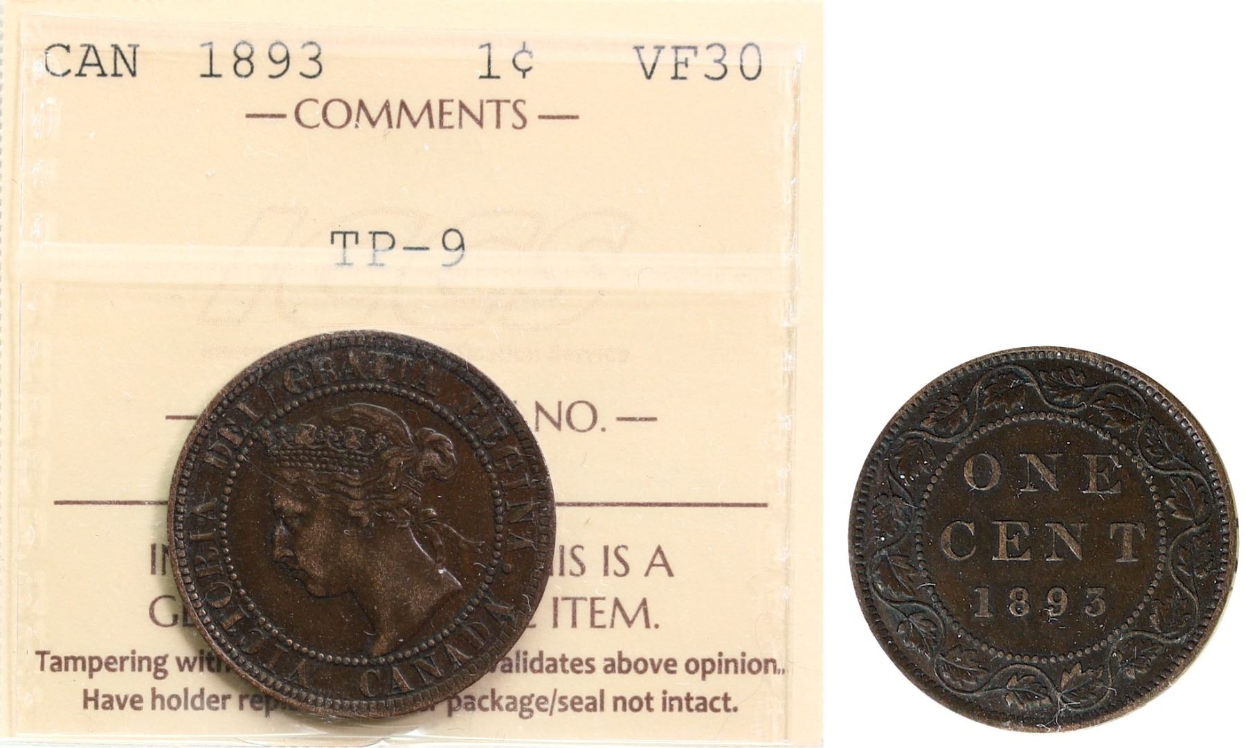 1893 1¢ "TRIPLE PUNCH 9" ICCS Choice Very Fine-30. Nice chocolate brown example.