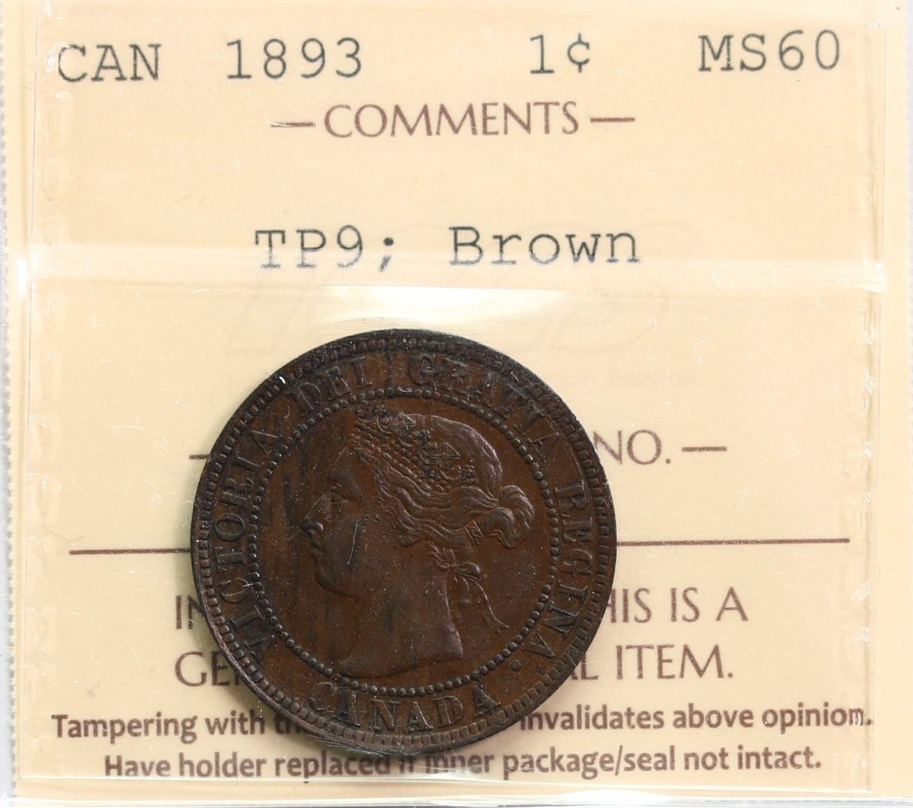1893 1¢ "TRIPLE PUNCH 9" ICCS Mint State-60. Nice chocolate brown example.