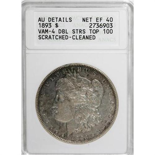 <B>1893 $1 Double Stars--Cleaned, Scratched--ANACS. AU Details, Net XF40.</B></I> VAM-4. A top 100 variety. NGC Census: (47/2431). PCGS Population (103/3930). Mintage: 389,792. Numismedia Wsl. Price for NGC/PCGS coin in XF40: $242. (#7220)<BR><BR><B>Coin Engraver:</B> George T. Morgan<BR><BR><b>Shipping:</b> Coins & Currency (<a target="_blank" href="http://www.heritageauctions.com/common/shipping.php">view shipping information</a>)