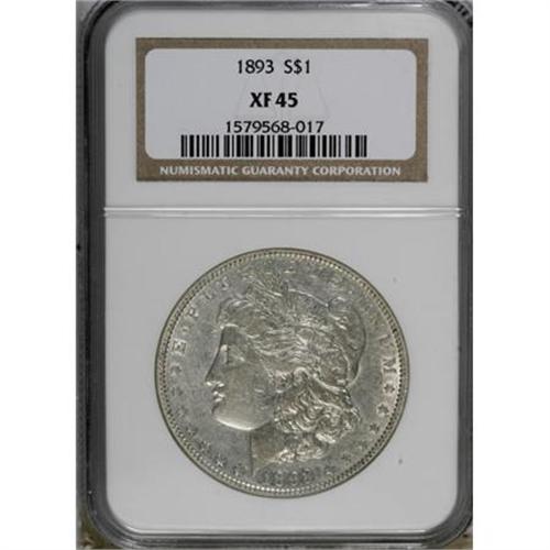 <B>1893 $1 XF45 NGC.</B></I> . NGC Census: (159/2266). PCGS Population (209/3717). Mintage: 389,792. Numismedia Wsl. Price for NGC/PCGS coin in XF45: $262. (#7220)<BR><BR><B>Coin Engraver:</B> George T. Morgan<BR><BR><b>Shipping:</b> Coins & Currency (<a target="_blank" href="http://www.heritageauctions.com/common/shipping.php">view shipping information</a>)