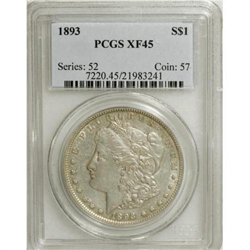 <B>1893 $1 XF45 PCGS.</B></I> PCGS Population (191/3450). NGC Census: (139/2161). Mintage: 389,792. Numismedia Wsl. Price for NGC/PCGS coin in XF45: $262. (#7220)<BR><BR><B>Coin Engraver:</B> George T. Morgan<BR><BR><b>Shipping:</b> Coins & Currency (<a target="_blank" href="http://www.heritageauctions.com/common/shipping.php">view shipping information</a>)