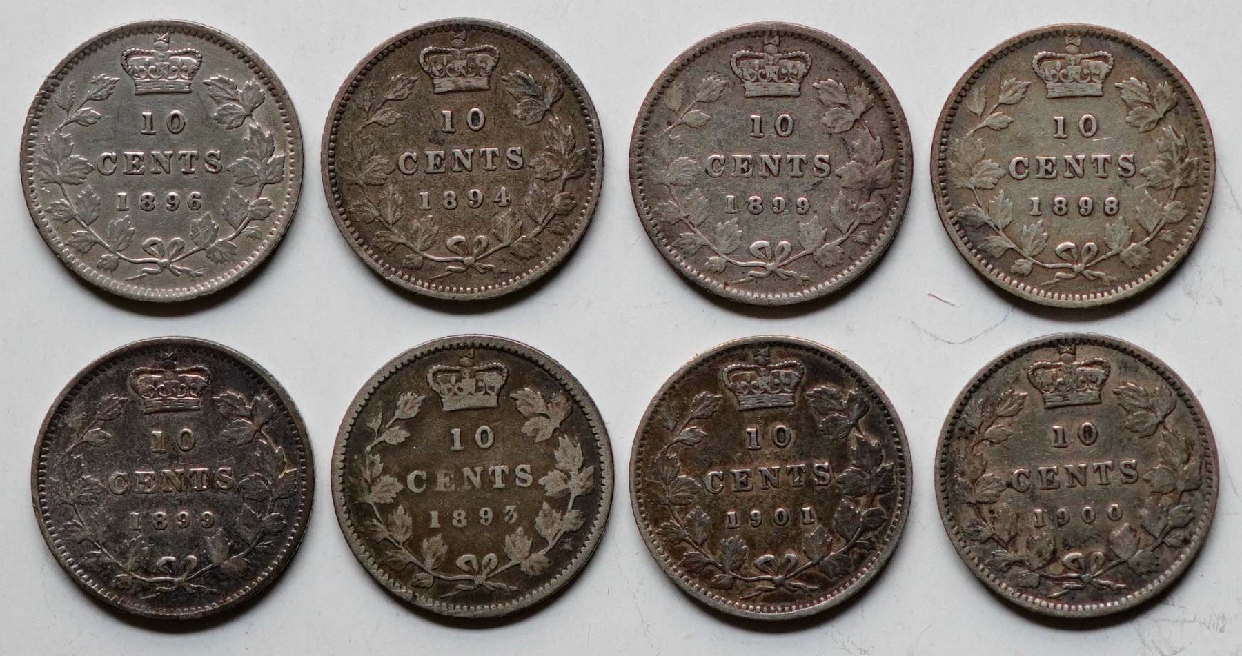 1893 10¢ FT to 1901. Lot of 8 coins VF and better on average w/some exceptions. See Pic.