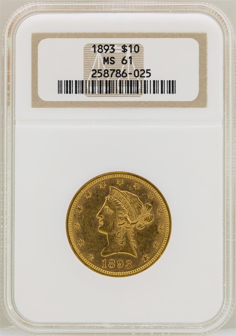 One 1893 $10 Liberty Head Eagle Gold Coin NGC MS61. NGC Certified.