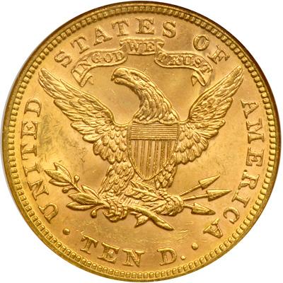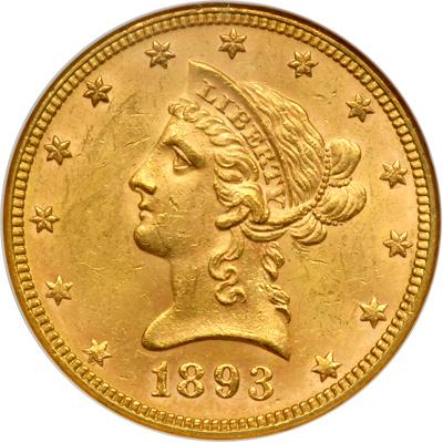 1893 $10 Liberty. NGC graded MS-62. Delicate golden toning with frosty devices (PCGS # 8725) .