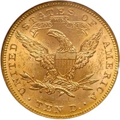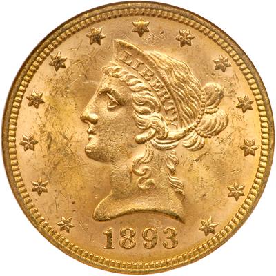 1893 $10 Liberty. NGC graded MS-64. Lightly toned; choice frosty surfaces with only minor bagmarks. Pop 598; 26 finer, 25 in 65, 1 in 66 (PCGS # 8725).