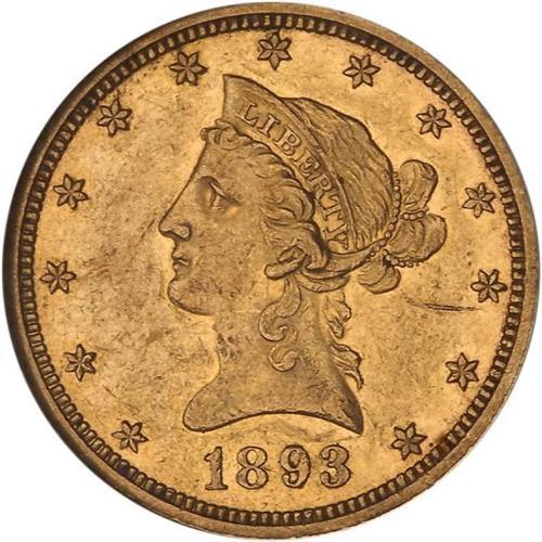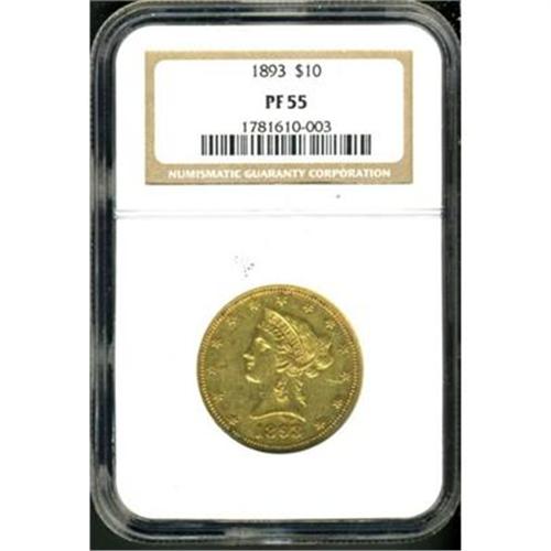 <b>1893 $10 Liberty. NGC graded Proof 55.</b> Pop: 1/4. Only 55 proofs were struck this year, but fewer exist today with around 15-18 survivors known. This is a very presentably coin that represents excellent value for the grade. The striking details are fully defined in every area and complemented by golden frost. They are set against reflective deep mirrors in the fields. Given the grade, the tiny contact marks in the fields that account for the grade are to be expected <b>(PCGS # 8833)</b> <i>