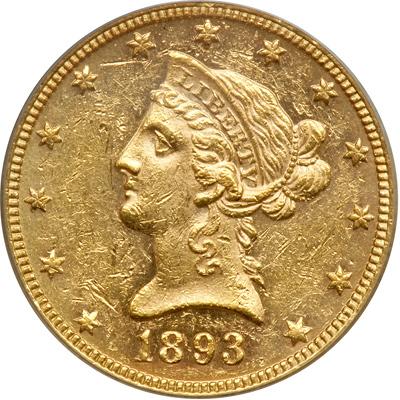 1893 $10 Liberty. PCGS graded MS-61. Lovely underlying semi-reflective fields. Lightly toned. Extensive bagmarks (PCGS # 8725) .