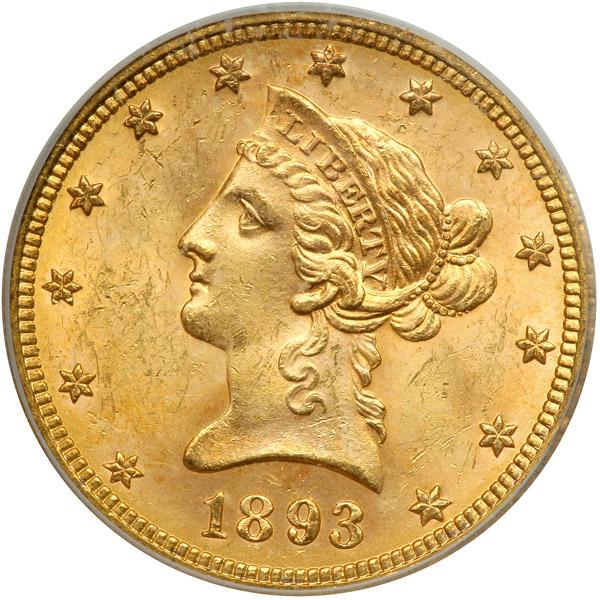 1893 $10 Liberty. ICG graded MS-64. Lightly toned and frosty, the color ranges from pinkish to warm mellow golden hues.