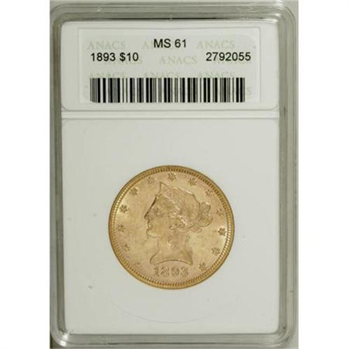 <B>1893 $10 MS61 ANACS.</B></I> NGC Census: (7062/14232). PCGS Population (4331/6974). Mintage: 1,840,895. Numismedia Wsl. Price for NGC/PCGS coin in MS61: $365. (#8725)<BR><BR><B>Coin Engraver:</B> Christian Gobrecht<BR><BR><b>Shipping:</b> Coins & Currency (<a target="_blank" href="http://www.heritageauctions.com/common/shipping.php">view shipping information</a>\)