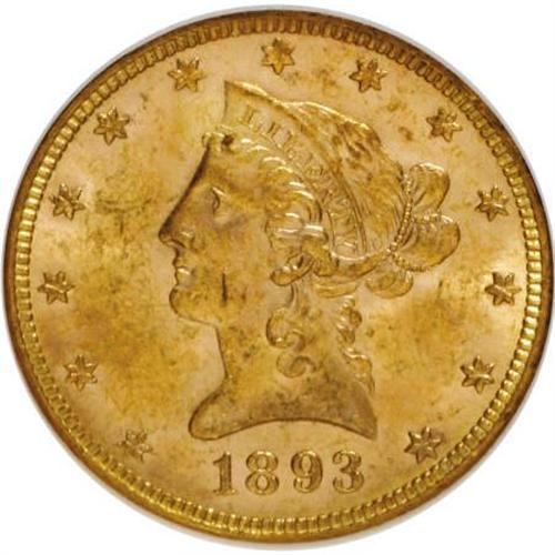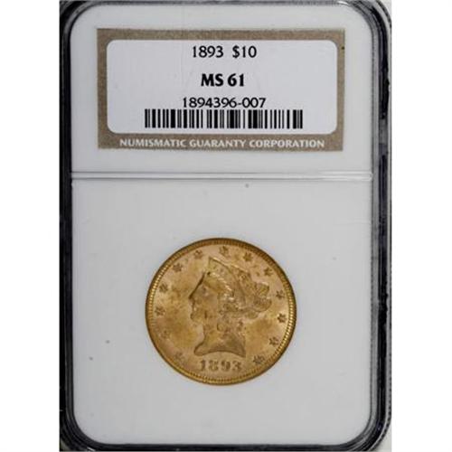 <B>1893 $10 MS61 NGC.</B></I> NGC Census: (7089/14275). PCGS Population (4343/7008). Mintage: 1,840,895. Numismedia Wsl. Price for NGC/PCGS coin in MS61: $365. (#8725)<BR><BR><B>Coin Engraver:</B> Christian Gobrecht<BR><BR><b>Shipping:</b> Coins & Currency (<a target="_blank" href="http://www.heritageauctions.com/common/shipping.php">view shipping information</a>\)