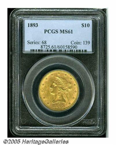 <B>1893<$10> MS61 PCGS.</B></I> Although luster does not dominate the exposed obverse field, this nicely struck apricot-gold Eagle has the eye appeal of a slightly finer grade. Small contact marks are noted on Liberty's jaw and in the left (facing) obverse field.