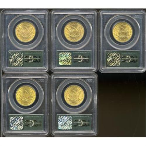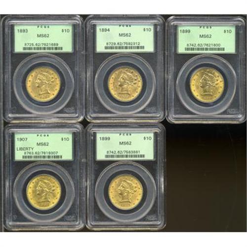 <B>1893 $10 MS62 PCGS; 1894 MS62 PCGS; (2)1899 MS62 PCGS; 1907 MS62 PCGS.</B></I><BR><BR><b>Shipping:</b> Coins & Currency (<a target="_blank" href="http://www.heritageauctions.com/common/shipping.php">view shipping information</a>)