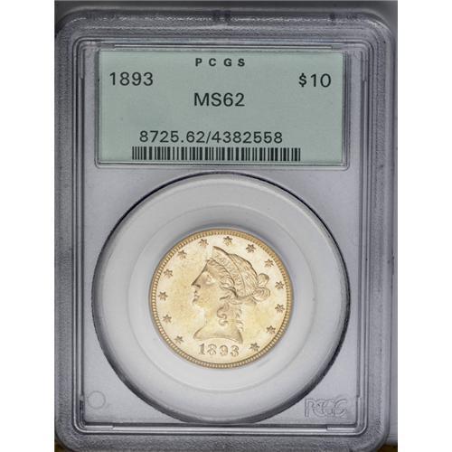 <B>1893<$10> MS62 PCGS.</B></I> Vibrant luster illuminates this crisply struck Liberty ten. The reverse is refreshingly clean, while the obverse has luster grazes appropriate to the grade. Encased in a green label holder.