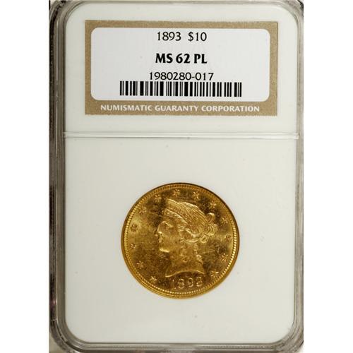 1893 $10 MS62 Prooflike NGC. A strongly reflective and