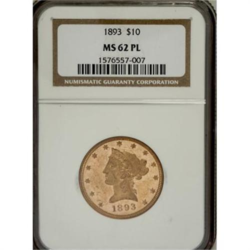 <B>1893 $10 MS62 Prooflike NGC.</B></I> A well struck and flashy Liberty ten that has an interesting worm-like strike-through (as made) near the branch stem. Distributed marks are principally confined to the obverse field. Census: 33 in 62 Prooflike, 13 finer (3/08).<BR><BR><B>Coin Engraver:</B> Christian Gobrecht<BR><BR><b>Shipping:</b> Coins & Currency (<a target="_blank" href="http://www.heritageauctions.com/common/shipping.php">view shipping information</a>)
