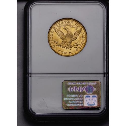 <B>1893<$10> MS63 NGC.</B></I> A lustrous coin featuring thick mint frost most notable on the obverse side. The strike is above average and the surfaces display a vibrant golden color. The numerous contact marks and abrasions that dot both sides are the major distractions.