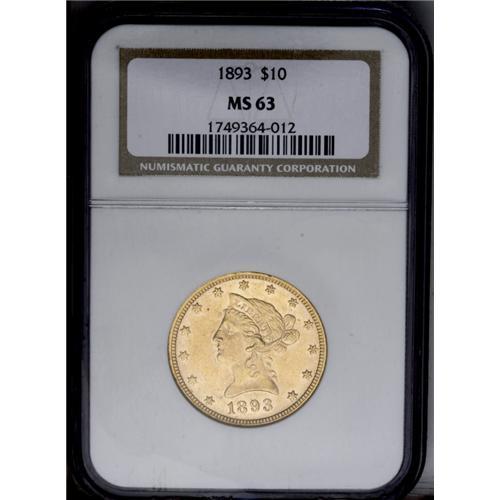 1893 $10 MS63 NGC. A shimmering, lightly marked repres