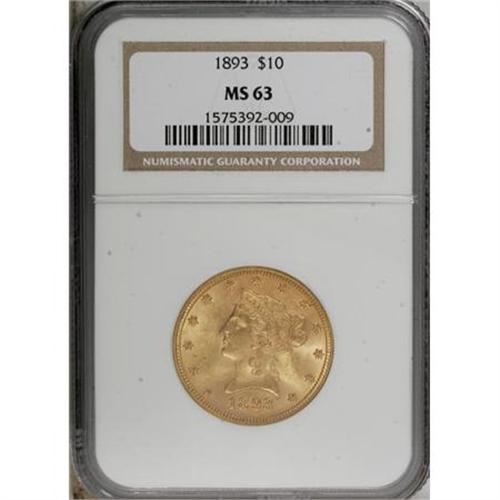 <B>1893 $10 MS63 NGC.</B></I> This sharply struck and lustrous ten dollar piece lacks mentionable marks, and will serve as a quality representative of the gold type.<BR><BR><b>Shipping:</b> Coins & Currency (<a target="_blank" href="http://www.heritageauctions.com/common/shipping.php">view shipping information</a>)