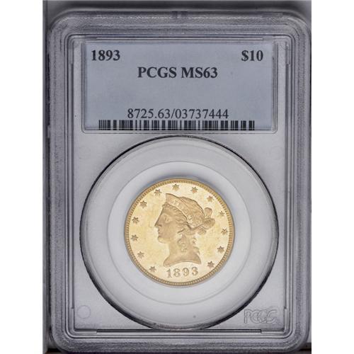 <B>1893<$10> MS63 PCGS.</B></I> The prooflike fields on this coin will surely capture the attention of several bidders, and the MS63 grade should make this an affordable, yet flashy type coin. Fully struck with rich orange-gold coloration and a noticeable presence of mint frost on the devices.