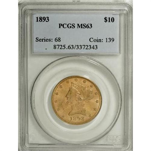 <B>1893 $10 MS63 PCGS.</B></I> PCGS Population (1663/151). NGC Census: (4887/574). Mintage: 1,840,895. Numismedia Wsl. Price for NGC/PCGS coin in MS63: $820. (#8725)<BR><BR><B>Coin Engraver:</B> Christian Gobrecht<BR><BR><b>Shipping:</b> Coins & Currency (<a target="_blank" href="http://www.heritageauctions.com/common/shipping.php">view shipping information</a>)