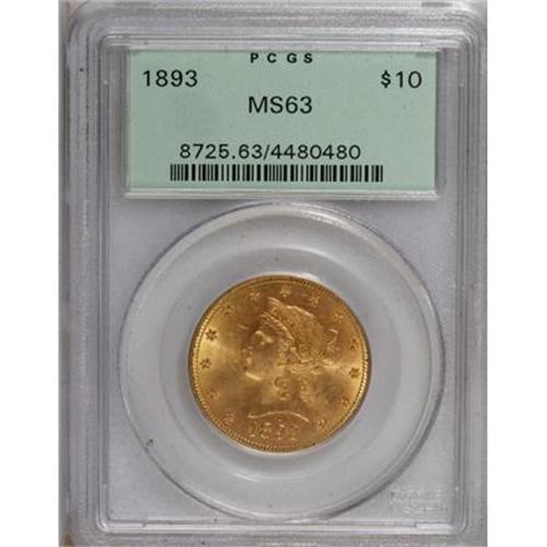 <B>1893 $10 MS63 PCGS.</B></I> PCGS Population (1671/151). NGC Census: (4887/574). Mintage: 1,840,895. Numismedia Wsl. Price for NGC/PCGS coin in MS63: $820. (#8725)<BR><BR><B>Coin Engraver:</B> Christian Gobrecht<BR><BR><b>Shipping:</b> Coins & Currency (<a target="_blank" href="http://www.heritageauctions.com/common/shipping.php">view shipping information</a>)