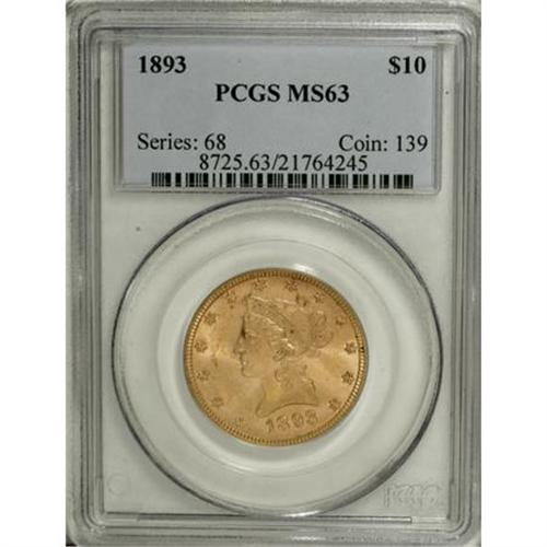 <B>1893 $10 MS63 PCGS.</B></I> PCGS Population (1728/157). NGC Census: (5011/578). Mintage: 1,840,895. Numismedia Wsl. Price for NGC/PCGS coin in MS63: $1,190. (#8725)<BR><BR><B>Coin Engraver:</B> Christian Gobrecht<BR><BR><b>Shipping:</b> Coins & Currency (<a target="_blank" href="http://www.heritageauctions.com/common/shipping.php">view shipping information</a>)