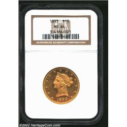 1893 $10 MS64 NGC. A particularly attractive coin that has prooflike fields with frosted devices tha