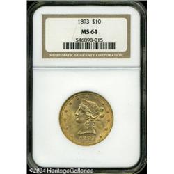 1893 $10 MS64 NGC. This meticulously struck near-G <B>1893 $10 MS64 NGC.</B></I> This meticulously struck near-Gem has vivid luster and a clean portrait. The fields are lightly marked, as is appropriate for the grade. <BR><BR><B>Important notice:</B> Heritage usually auctions material at the rate of 200-250 lots per hour. On some occasions eBay Live bid software or the Internet may not be able to keep up with the pace of the auction. We recommend placing a realistic absentee bid now as insurance to avoid disappointment. Occasionally the auctioneer may eliminate or reject an eBay Live bid, and the auctioneer may also reopen a lot after the close of the eBay live bidding (usually because we missed an audience bid), and may reject your bid even if it shows you as the winning bidder. By bidding via eBay Live, you agree that Heritage may award the lot to another bidder at its sole discretion under the circumstances described above or any other reasonable circumstances. Since eBay bids are not shown to us until we open the lot on the floor, we treat those bids just like floor bids. In most cases the floor responds before the eBay bid is presented to us, due to Internet lag time, so for consistency we have made it a policy that floor bids are always considered first over tie eBay live bids. Also please note that all Heritage lots purchased through eBay Live carry a 20% Buyer's Premium. Please make sure you read the Terms and Conditions before you bid. This lot is being auctioned in conjunction with a live floor auction by Heritage Galleries & Auctioneers. All final auction and invoice information will be supplied by Heritage Galleries & Auctioneers, and all other information should be considered preliminary. Lot:6771