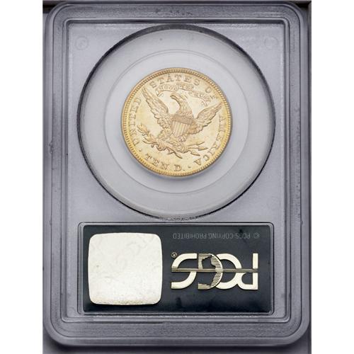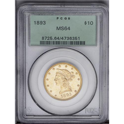 <B>1893<$10> MS64 PCGS.</B></I> Potent luster and radiant honey-gold surfaces proclaim the eye appeal of this attentively struck and lightly marked near-Gem. Encapsulated in a green label holder. PCGS has certified just one piece finer, as MS65.