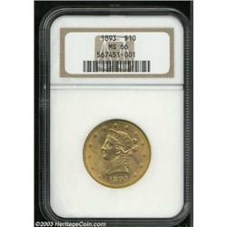 <table><tr><td><TABLE cellSpacing=0 cellPadding=0 width="100%" bgColor=#000000 border=0><TBODY> <TR><TD width="100%"><TABLE cellSpacing=1 cellPadding=3 width="100%" border=0><TBODY><TR><TD width="100%" bgColor=#79735c><FONT face=arial color=#ffffff size=3><B>Description</B> </FONT></TD></TR><TR><TD width="100%" bgColor=#ffffff><FONT face=arial size=2><B>1893 $10 MS66 NGC.</B></I> One of the more readily obtainable Liberty Eagles in average Uncirculated condition, but its numbers taper off at the MS64 tier and Gems are legitimately rare. This impeccable, satiny example, currently the only 1893 Eagle certified MS66 by either major service, is draped in reddish patina and has only the wispiest blemishes in the fields. Population: 1 in 66, 0 finer (7/03). </FONT></TD></TR></TBODY></TABLE></TD></TR></TBODY></TABLE><BR><A name=PricesRealized></A><TABLE cellSpacing=0 cellPadding=0 width="100%" bgColor=#000000 border=0><TBODY><TR><TD width="100%"><TABLE cellSpacing=1 cellPadding=3 width="100%" border=0><TBODY><TR><TD width="100%" bgColor=#79735c><A name=PR><FONT face=arial color=#ffffff size=3><B>Previous Prices from Heritage Auctions</B> </FONT></A></TD></TR><TR><TD bgColor=#f6f6ed>No Prior Data Recorded </TD></TR><TR><TD bgColor=#ffffff><FONT face=arial size=1 ?>PLEASE NOTE: All prices realized reflect the final hammer price PLUS the buyer's premium in auctions that charge a buyer's premium. Each item has a notation at the top of the listing indicating whether that lot included a buyer's premium. Example: A item that sells with a final hammer price of $100 and a 20% buyer's premium will display with a price realized of $120. All information listed is intended to be as accurate as possible, but errors are possible. Please use this guide carefully and inform us of any inaccuracies. </FONT></TD></TR></TBODY></TABLE></TD></TR></TBODY></TABLE><BR><TABLE cellSpacing=0 cellPadding=0 width="100%" bgColor=#000000 border=0><TBODY><TR><TD width="100%"><TABLE cellSpacing=1 cellPadding=3 width="100%" border=0><TBODY><TR><TD width="100%" bgColor=#79735c colSpan=6><FONT face=arial color=#ffffff size=3><B>Price Guide*</B> </FONT></TD></TR><TR bgColor=#f6f6ed><TD align=middle><B>Grade</B> </TD><TD align=middle><B>Coin World<BR>(Trends)</B> </TD><TD align=middle><B>Numismedia<BR>Retail</B> </TD><TD align=middle><B>Numismedia<BR>Wholesale</B> </TD><TD align=middle><B>Coin<BR>Universe</B> </TD><TD align=middle><B>Heritage<BR>Value Index</B> </TD></TR><TR bgColor=#ffffff><TD align=middle>65</TD><TD align=right>---</TD><TD align=right>---</TD><TD align=right>$4,875.00</TD><TD align=right>---</TD><TD align=right>$6,820.50</TD></TR><TR style="FONT-WEIGHT: bold" bgColor=#cccfdd><TD align=middle>66</TD><TD align=right>---</TD><TD align=right>---</TD><TD align=right>---</TD><TD align=right>---</TD><TD align=right>$10,248.00</TD></TR><TR bgColor=#ffffff><TD align=middle>67</TD><TD align=right>---</TD><TD align=right>---</TD><TD align=right>---</TD><TD align=right>---</TD><TD align=right>$14,850.00</TD></TR><TR bgColor=#ffffff><TD colSpan=6><FONT size=1>*All information listed is intended to be as accurate as possible, but errors are possible. No item may be returned or refused based on this information which is provided as a service to our customers. You should contact each pricing source directly to determine the accuracy of this information. </FONT></TD></TR></TBODY></TABLE></TD></TR></TBODY></TABLE><BR><TABLE cellSpacing=0 cellPadding=0 width="100%" bgColor=#000000 border=0><TBODY><TR><TD width="100%"><TABLE cellSpacing=1 cellPadding=3 width="100%" border=0><TBODY><TR><TD width="100%" bgColor=#79735c><FONT face=arial color=#ffffff size=3><B>Population Guide</B> </FONT></TD></TR><TR bgColor=#ffffff><TD align=middle><!-- Begin Output of Population Grid--><TABLE cellSpacing=0 cellPadding=0 width="100%" border=0><TBODY><TR><TD vAlign=center><TABLE cellSpacing=0 width="100%" border=1 cellsadding="3"><TBODY><TR><TD vAlign=center><TABLE cellSpacing=0 cellPadding=3 width="100%" border=1><TBODY><TR><TD vAlign=center align=middle bgColor=#f0f1e8 colSpan=2 <CENTER><FONT face=Arial size=2><B>PCGS Pop </B></FONT><CENTER></CENTER></TD><TD vAlign=center align=middle bgColor=#f0f1e8 colSpan=2><CENTER><FONT face=Arial size=2><B>NGC Pop</B></CENTER></FONT></TD></TR><TR><TD vAlign=center><FONT face=Arial size=2>(66)</FONT> </TD><TD vAlign=center align=right><FONT face=Arial size=2>0</FONT> </TD><TD vAlign=center><FONT face=Arial size=2>(66)</FONT> </TD><TD vAlign=center align=right><FONT face=Arial size=2>1</FONT> </TD></TR><TR><TD vAlign=center><FONT face=Arial size=2>(>66)</FONT> </TD><TD vAlign=center align=right><FONT face=Arial size=2>0</FONT> </TD><TD vAlign=center><FONT face=Arial size=2>(>66)</FONT> </TD><TD vAlign=center align=right><FONT face=Arial size=2>0</FONT> </TD></TR></TBODY></TABLE></TD></TR></TBODY></TABLE></TD></TR></TBODY></TABLE><!-- End Output of Population Grid--></TD></TR></TBODY></TABLE></TD></TR></TBODY></TABLE><BR><TABLE cellSpacing=0 cellPadding=0 width="100%" bgColor=#000000 border=0><TBODY><TR> Important notice: Heritage usually auctions material at the rate of 200-250 lots per hour. On some occasions eBay Live bid software or the Internet may not be able to keep up with the pace of the auction. We recommend placing a realistic absentee bid now as insurance to avoid disappointment. Occasionally the auctioneer may eliminate or reject an eBay Live bid, and the auctioneer may also reopen a lot after the close of the eBay live bidding (usually because we missed an audience bid), and may reject your bid even if it shows you as the winning bidder. By bidding via eBay Live, you agree that Heritage may award the lot to another bidder at its sole discretion under the circumstances described above or any other reasonable circumstances. Also please note that all Heritage lots purchased through eBay Live carry a 20% Buyer's Premium. Please make sure you read the Terms and Conditions before you bid.</TD></TR></TBODY></