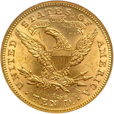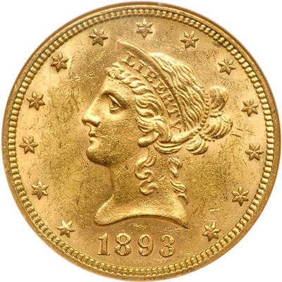 1893 $10. NGC graded MS-62. Predominantly untoned with heavy luster.