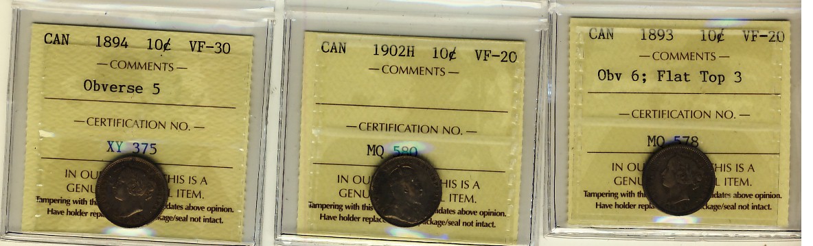 1893 10¢ Obv 6 FT, 1902H VF20 & 1894 VF30. Lot of 3 ICCS graded coins.