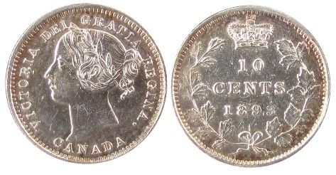 1893 10¢ Obv 6 Round Top ICCS EF45. Brilliant and lustrous.