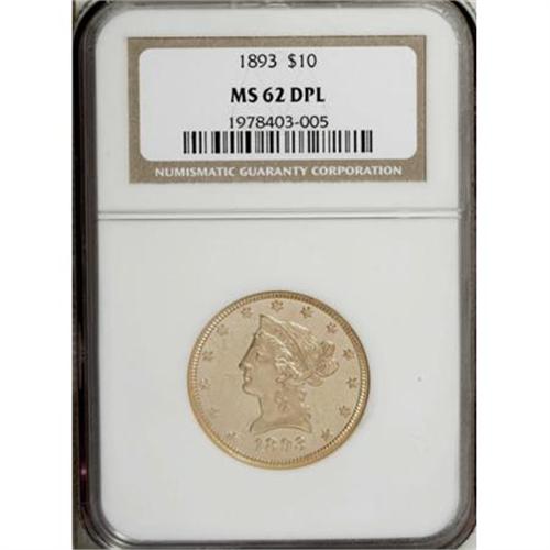 <B>1893 $10 MS62 Deep Mirror Prooflike NGC.</B></I> The luminous devices provide noticeable contrast with the mirrored fields. Typically abraded, but certainly rare with such a degree of surface reflectivity. NGC has certified three 1893 eagles as Deep Mirror Prooflike, with the present lot as the single finest (6/07).<BR><BR><B>Coin Engraver:</B> Christian Gobrecht<BR><BR><b>Shipping:</b> Coins & Currency (<a target="_blank" href="http://www.heritageauctions.com/common/shipping.php">view shipping information</a>\)