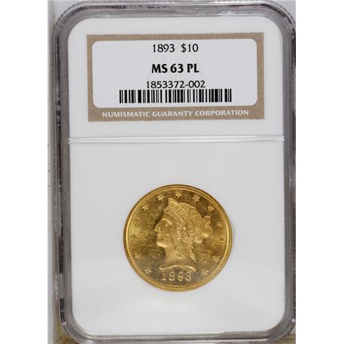 <B>1893 $10 MS63 Prooflike NGC.</B></I> A very sharp peach-gold ten dollar that yields great motif-field contrast, and sharply impressed features. Scattered light abrasions define the grade. Census: 9 in 63 Prooflike, 1 finer (11/06).<BR><BR><b>Shipping:</b> Coin/Currency (<a target="_blank" href="http://www.heritageauctions.com/common/shipping.php">view shipping information</a>)