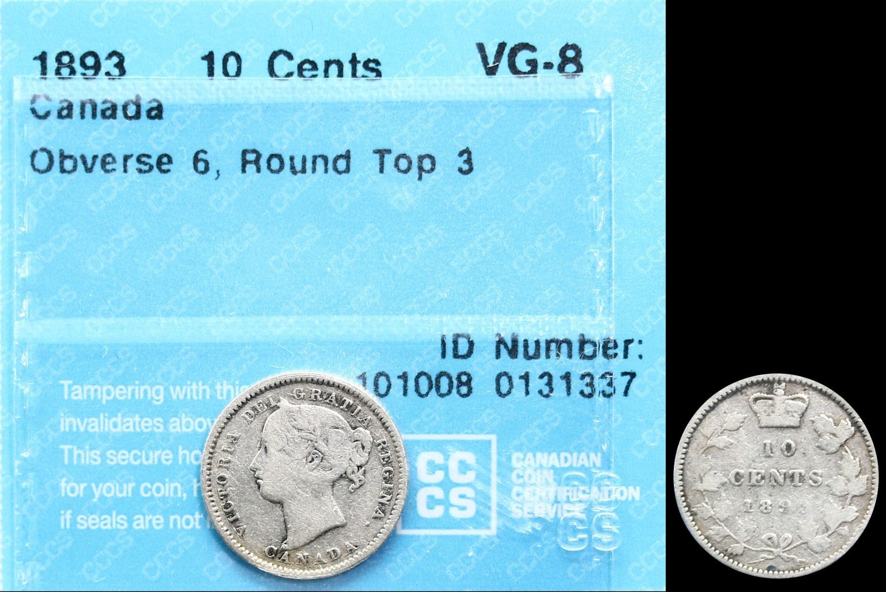 1893 10¢ "Round Top 3 - OBV.6" CCCS Very Good-8. Nice example with typical weak 3.