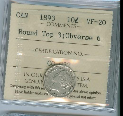 1893 10¢ Round Top Obv. 6 ICCS VF20. Rare variety!