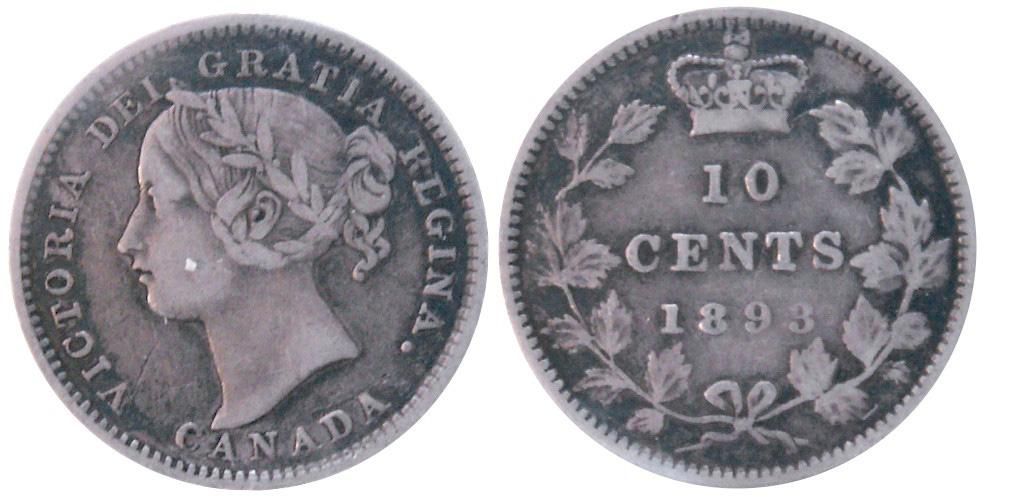1893 10¢ Round Top Obv 6 ICCS VF20. Well defined example.