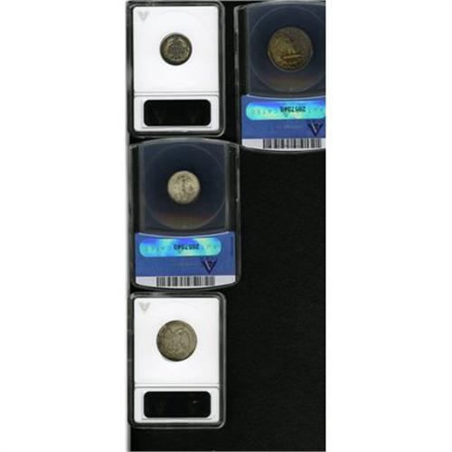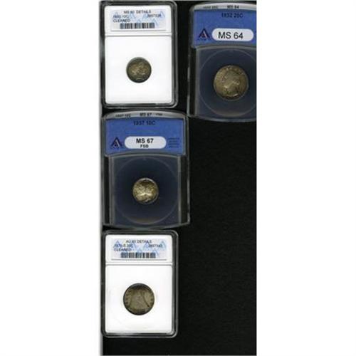 <B>1893<10C> Dime--Cleaned--ANACS, MS60 Details,</B></I> elliptical blue and gold peripheral toning; <B>1937 Dime MS67 Full Bands ANACS,</B></I> spectacular multicolored toning highlights the obverse; <B>1875-S Twenty Cents--Cleaned--ANACS, AU55 Details,</B></I> precision cleaning is targeted at the obverse portrait; and a <B>1932 Quarter MS64 ANACS,</B></I> toned in beautiful amber and emerald-green shades.
