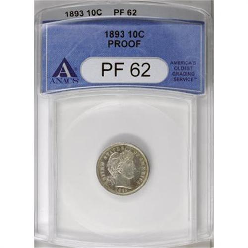 <B>1893 10C PR62 ANACS.</B></I> NGC Census: (9/188). PCGS Population (11/128). Mintage: 792. Numismedia Wsl. Price for NGC/PCGS coin in PR62: $283. (#4877)<BR><BR><B>Coin Engraver:</B> Charles E. Barber<BR><BR><b>Shipping:</b> Coins & Currency (<a target="_blank" href="http://www.heritageauctions.com/common/shipping.php">view shipping information</a>)